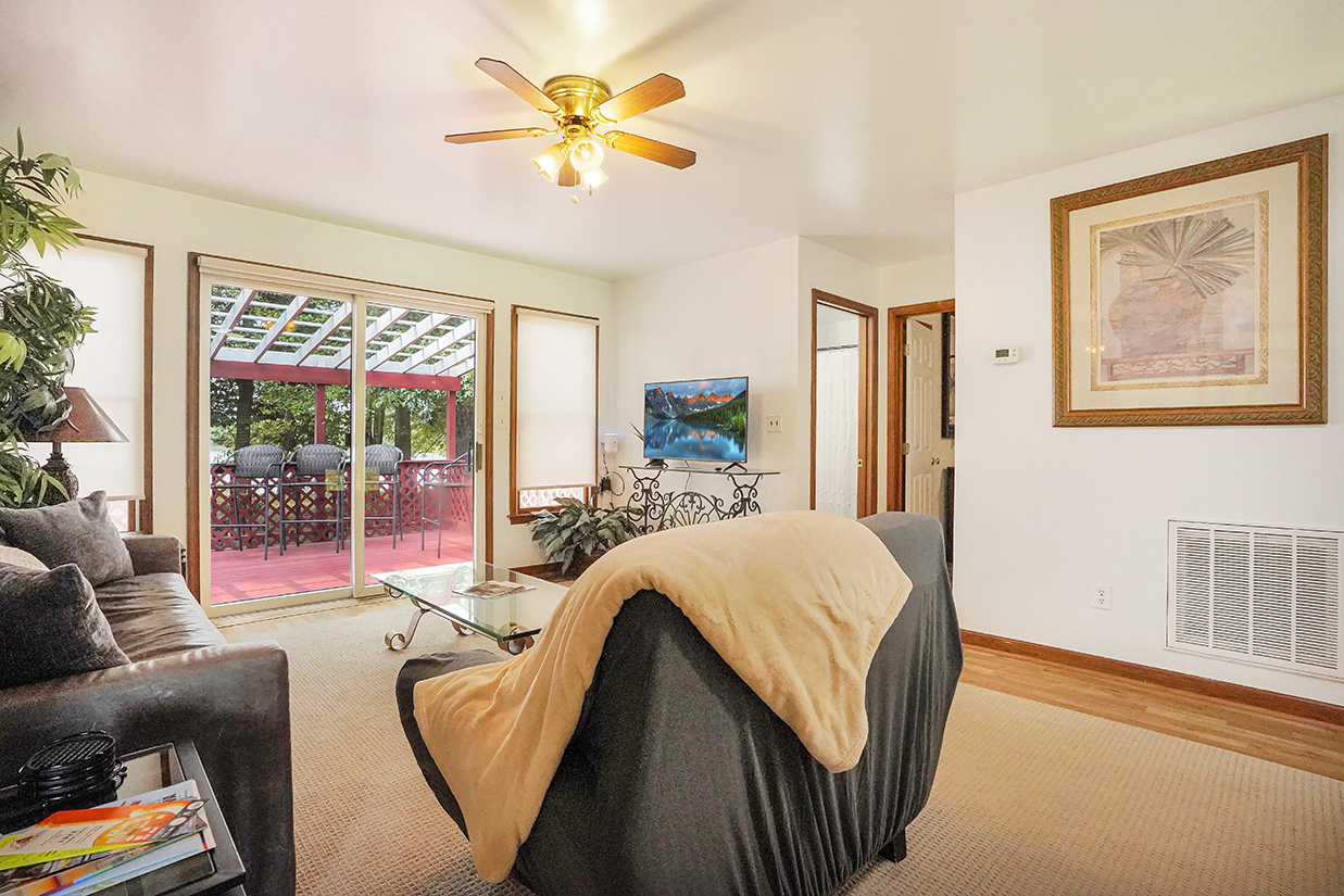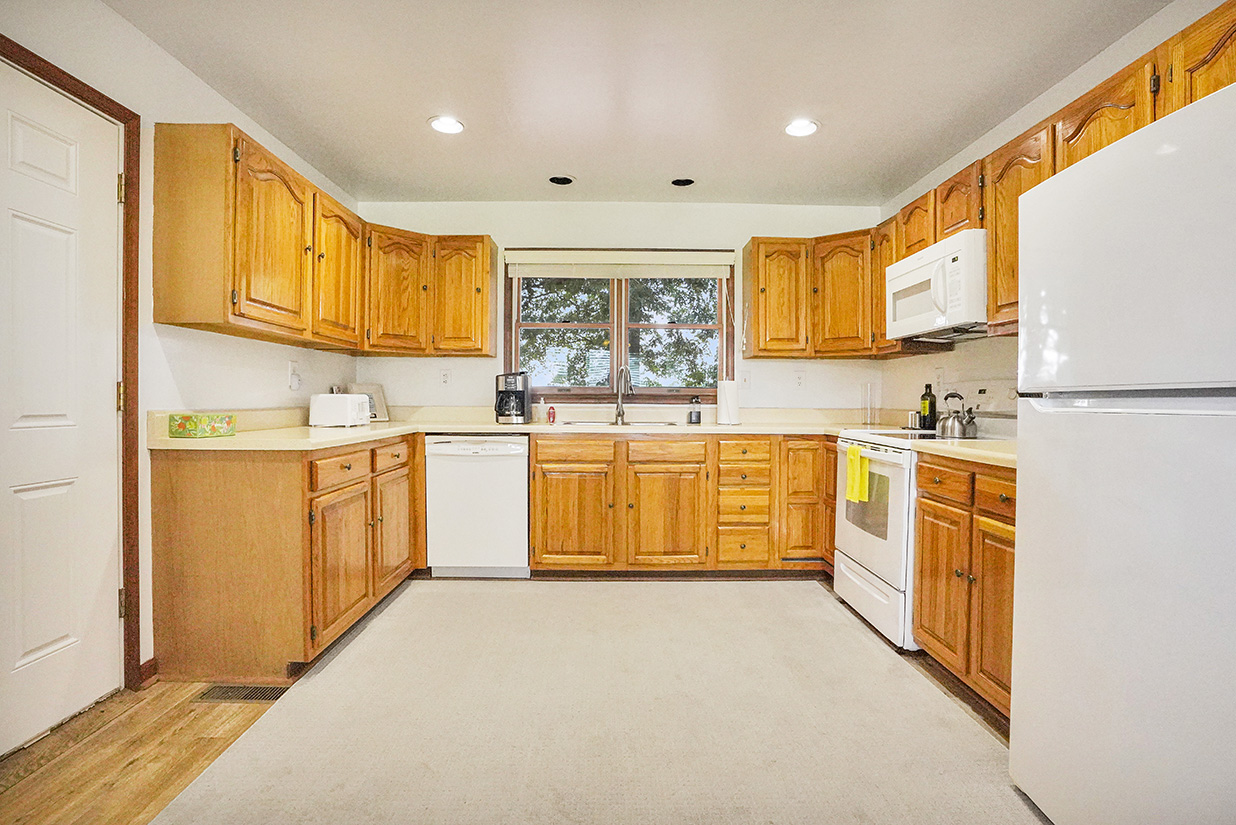 The Bayside Home built 1996, is about 1,278 square feet. Eat-in kitchen, laundry room, family room, separate master bedroom and bath, 2 bedrooms and bathroom upstairs. The Bayside home also features a waterfront fire pit and deck out onto the water.